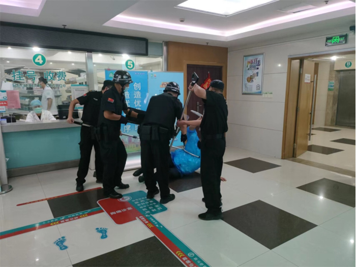 保安隊長緊急啟動醫(yī)院反恐應(yīng)急預(yù)案,指揮保安員迅速展開反恐防暴行動,持防暴盾、防暴棍、鋼叉等防暴器械,采用前后合擊戰(zhàn)術(shù),迅速出擊,一舉制服。至此,此次反恐防暴演練順利結(jié)束。