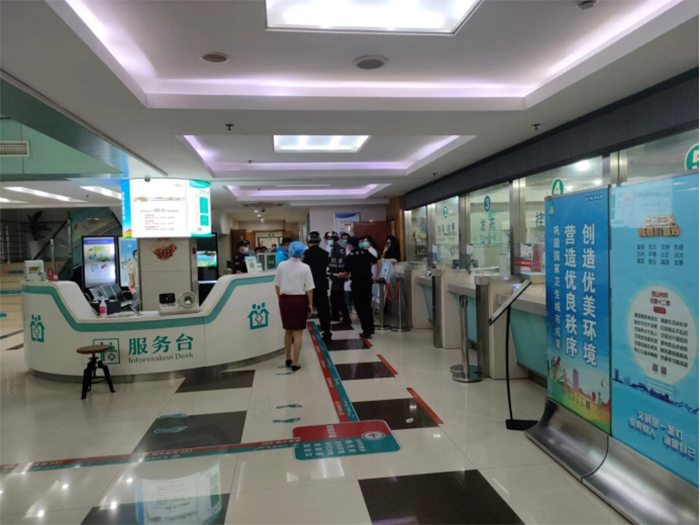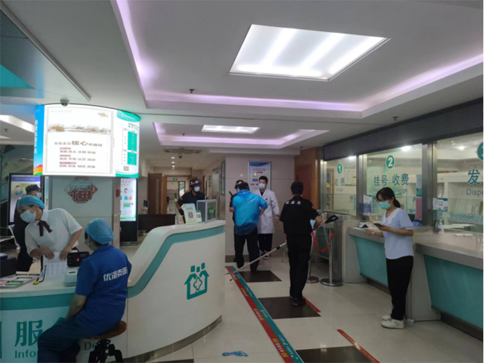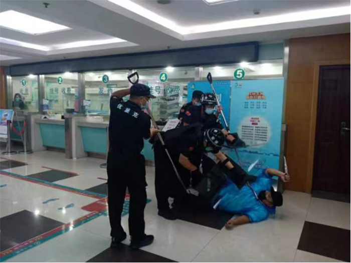演練現(xiàn)場模擬一暴恐分子持刀強(qiáng)行闖崗,執(zhí)勤保安迅速報保衛(wèi)科及分管領(lǐng)導(dǎo),并撥打110報警電話,同時疏散就醫(yī)群眾和工作人員。
